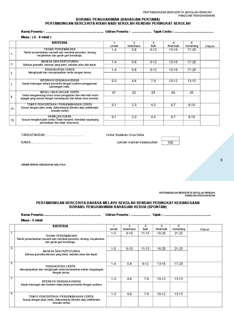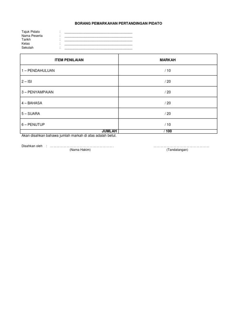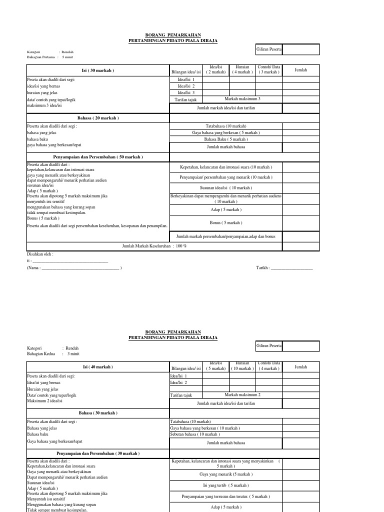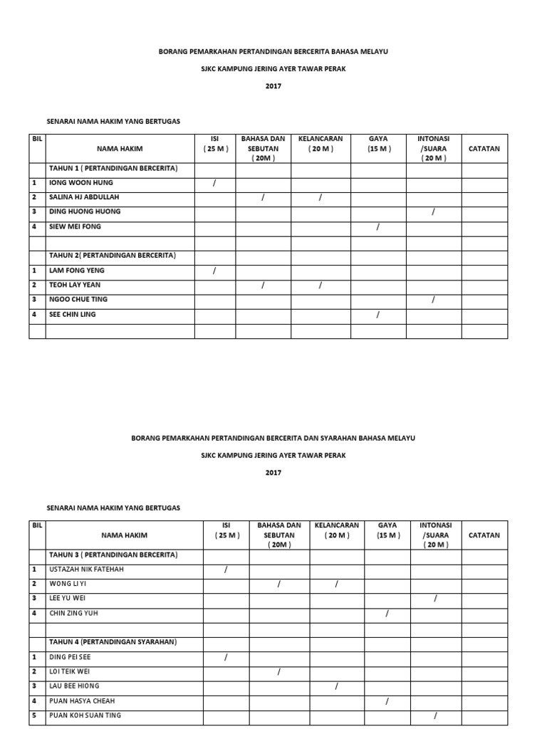 Borang penghakiman (bahagian pertama) pertandingan bercerita bahasa melayu sekolah rendah peringkat kebangsaan nama. Sebutkan kelebihan dan pencapaian pribadi, serta gambarkan diri secara positif. Borang markah chef rimba 1. Borang pemarkahan pertandingan hiasan basikal merdeka sempena sambutan kemerdekaan 2018. Bil nama murid bahan kitar kreativiti persembahan jumlah kedu dukan.