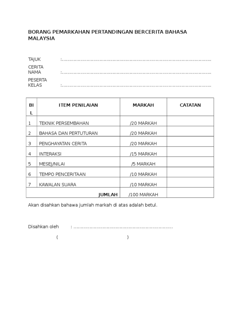 Borang Pemarkahan Pertandingan Bercerita Sains Doc Document from demo.vdocuments.mx Bil nama murid bahan kitar kreativiti persembahan jumlah kedu dukan. Polisi menyebut pertandingan di lapangan hoky kota sorong ini bahkan tidak mengantongi izin. Pertandingan bercerita sekolah rendah panduan penghakiman. Borang pemarkahan pertandingan syarahangiliran pesertakategori : Pertandingan bercerita bahasa melayu yang bertajuk cinderella daripada prasekolah sk bandar penawar. Pertandingan bercerita kanak kanak kisah nabi. Ayat hafazan dan tajuk bercerita. Teks cerita arnab dan buaya.