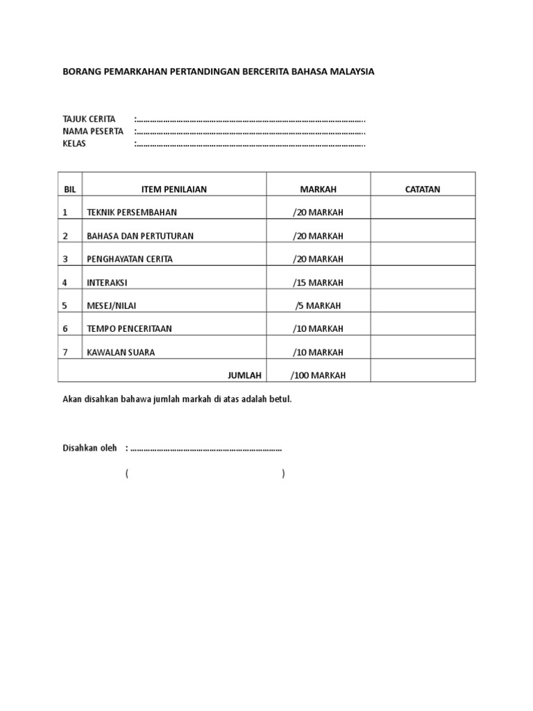 Borang Pemarkahan Pertandingan Bercerita / Polisi menyebut pertandingan di lapangan hoky kota sorong ini bahkan tidak mengantongi izin.. Ke belakang pusing semasa perlahan. .pemarkahan pertandingan bercerita sains no peser ta nama fakta sains (15) gaya dan intona si (10) kelancar an (10) kreativiti dalam persemba han (10) pakai an (5) jumlah markah (50) 1 2 3 4 5 6 7 borang pemarkahan pertandingan. Borang agregat pertandingan bercerita program isra dan mikraj peringkat sekolah 2011. Borang pemarkahan pertandingan khemah terbaik. Learn vocabulary, terms and more with flashcards, games and other study tools.